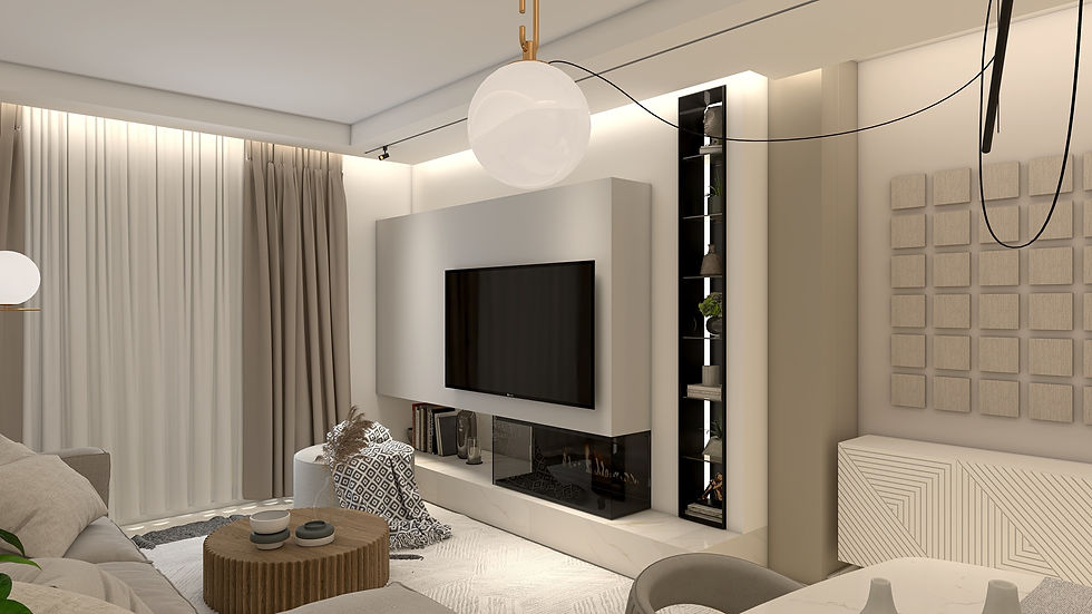 Dettaglio della parete TV che evidenzia la palette beige e nera, con elementi dal design semplice ma raffinato.